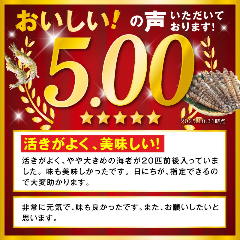 - 【ふるさと納税】高評価 ★5.00 延岡どれ クルマエビ 選べる 内容量 500g 800g 1000g 活き車海老 えび 指定日お届け 刺身 塩焼き エビチリ エビフライ パスタ お祝い事 養殖 身がぷりぷり 新鮮 海鮮 魚介類 海の幸 お取り寄せ お取り寄せグルメ 宮崎県 延岡市 送料無料