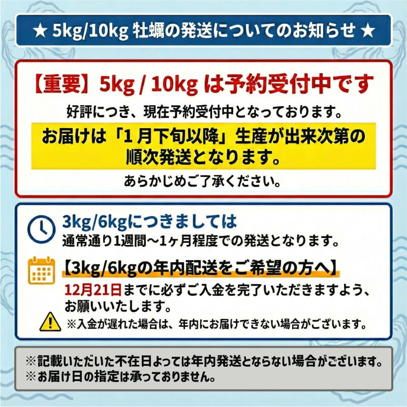 - 【ふるさと納税】 訳あり 牡蠣 3kg/5kg/6kg(3kg×2)/10kg(5kg×2)(生食可) かき カキ 冷凍 岩手県産 殻付き 生食 生食用 新鮮 濃厚 訳あり わけあり 大きさ 不揃い 三陸 産 カンカン焼き アヒージョ BBQ バーベキュー 鍋 フライ キャンプ 貝 海のミルク 岩手県 大船渡市