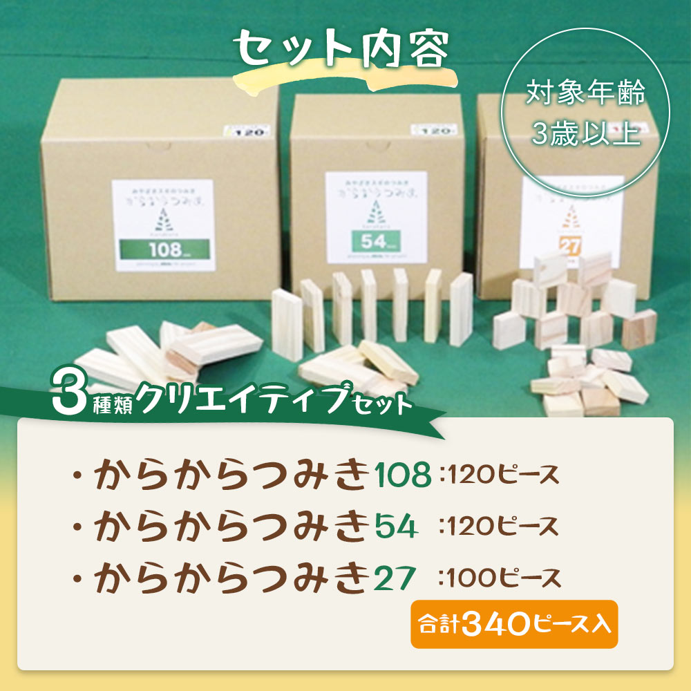 <からからつみき3種類クリエイティブセット340P>木のおもちゃ 知育玩具 子供 おもちゃ 積み木 男の子 女の子 子ども プレゼント ギフト 贈答 4歳 5歳 安心 安全 国産 宮崎県産 杉 木材 ベビー向け 誕生日 贈り物 お祝い【B-1708-bo】【boofoowoo】