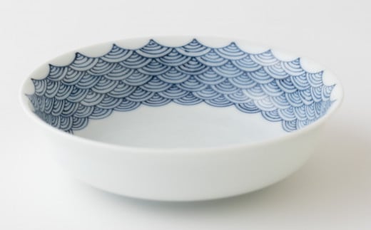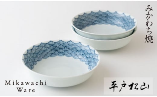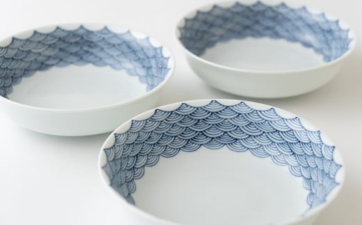 - 〈平戸松山窯〉創作染付間取青海波丸深取鉢3枚揃