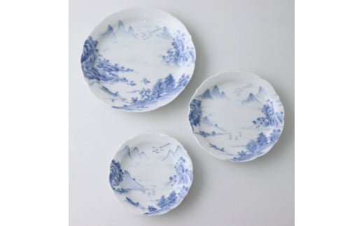 〈平戸松山窯〉山水紋揃い皿(3枚セット)