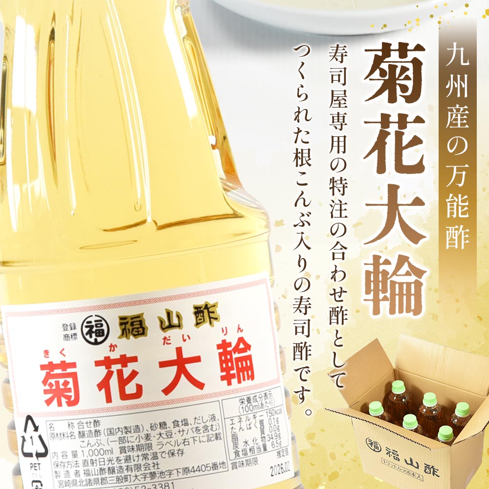 - <九州産の万能酢 菊花大輪(根こんぶ入り) 1L×6本>長期静置発酵による熟成にこだわり製造【A-1801-fy】【福山酢販売有限会社】
