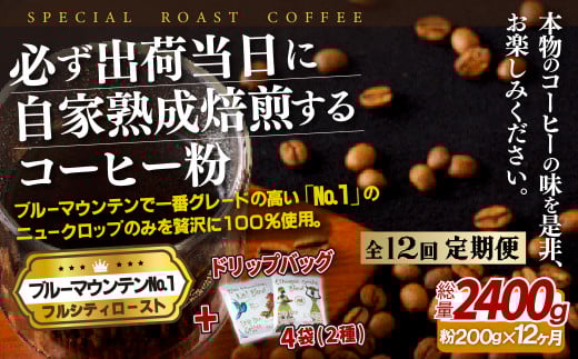 - 《定期便》必ず出荷日に自家熟成焙煎ブルーマウンテンNo.1粉(200g)+ドリップバッグ4パック【12回お届け】