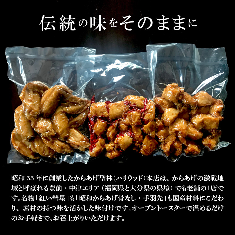 【からあげ聖林】紅い彗星(400g)と昭和からあげ骨なし(胸肉400g)手羽先(400g)のセット KH4002