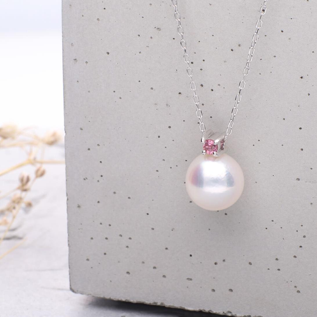 - 10月 誕生石 ピンクトルマリン 無調色 アコヤ真珠(日本) 8.0mm ラウンド Pt900 プラチナ ペンダント ネックレス(チェーン付き)