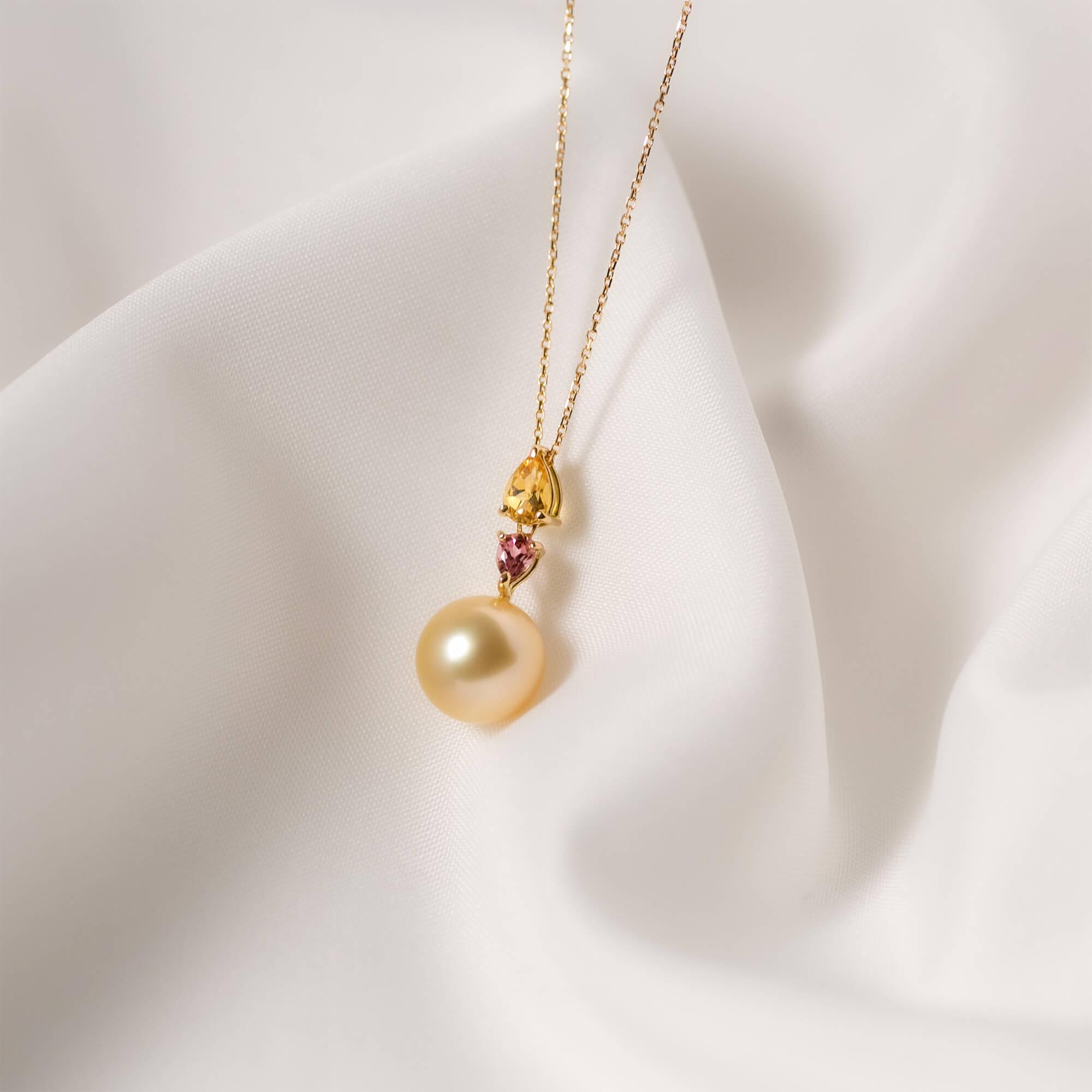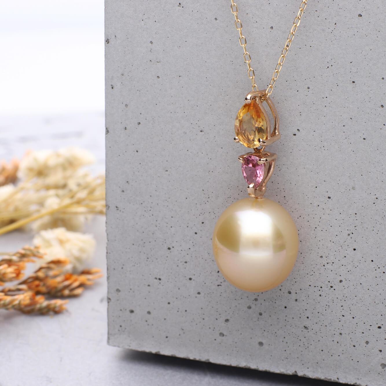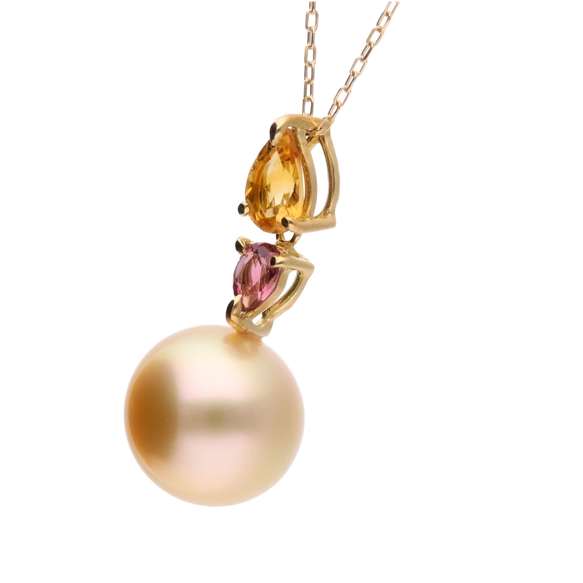 - 【水仙】ゴールデンパール(南洋 白蝶真珠) 10mm セミラウンド シトリン ピンクトルマリン K18 イエローゴールド ペンダントトップ