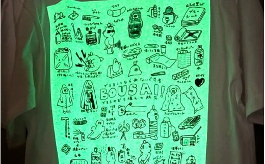 暗闇で光る蓄光プリント BOUSAI Tシャツ Mサイズ 【2026年1月以降順次発送】 | 饅頭VERYMUCH 能登 復興支援 震災支援 防災グッズ 災害対策 停電対策 ファッション 日常使い 半袖 S M L XL 綿100% ポップ かわいい イラスト イラストレーター デザイナー アーティスト 作家 芸術 アート 現代アート オリジナル