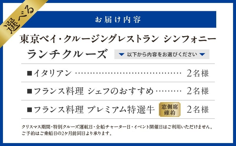 - ランチクルーズ 2名さま 各コース(イタリアン・フランス料理) │ 東京 都内 東京湾 お台場 クルージング 観光 旅行 体験 体験型 デート 記念日 誕生日 船上 遊覧 景色 絶景 フレンチ ペア チケット 乗船券 食事券 ギフト 贈り物