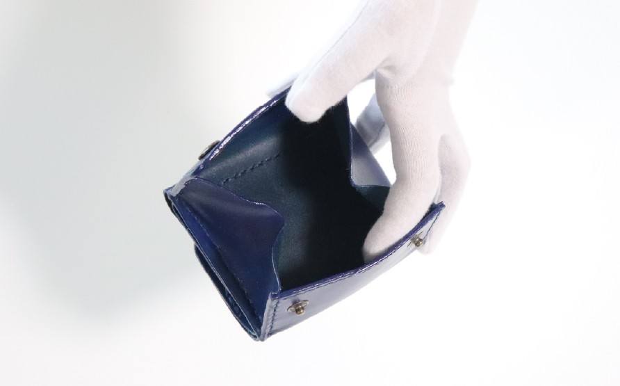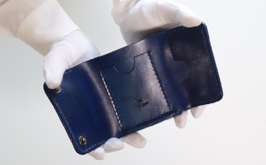 コンパクト財布(バスケット柄カービング・青系)| 牛ヌメ革 財布 ウォレット 本革 レザー 革 革製品 革小物 コンパクト 経年変化 一点物 一生もの ハンドメイド クラフト 高級 本格 ギフト プレゼント おすすめ