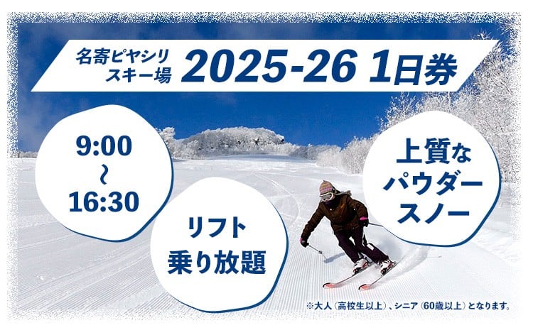 名寄ピヤシリスキー場 リフト1日券 or リフトシニア1日券(2025-26シーズン)名寄振興公社《12月上旬-2月中旬出荷予定(土日祝除く)》北海道 名寄市 旅行 温泉 体験 割引券 旅行券 商品券 グルメ スキー スノボ 食べる 泊まる 遊ぶ アクティビティ リフト券