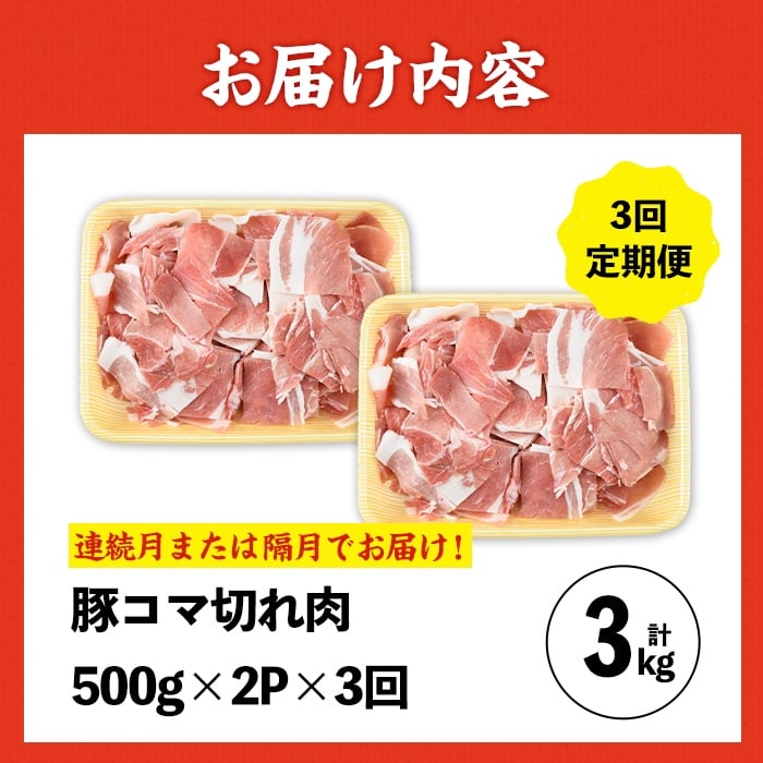 i1207 <定期便・計3回(連続月or隔月選べる!)>九州産 豚コマ切れ肉 (500g×2P×3回・計3kg) 鹿児島 豚肉 ポーク 小間切れ こま切れ 豚小間 細切れ 豚汁 炒め物 冷凍 定期便 配送間隔が選べる 500g 【ナンチク】