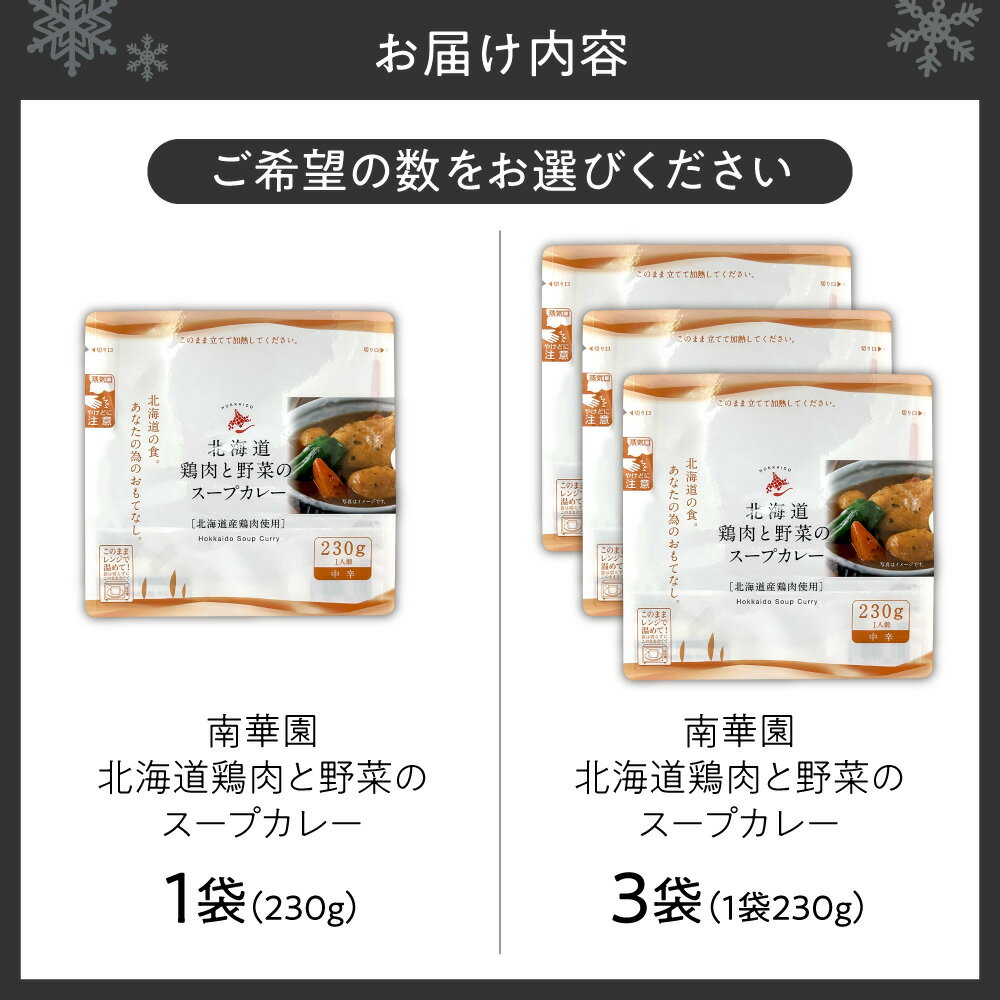 【ふるさと納税】 スープカレー 北海道産 鶏肉 野菜 【 選べる 数量 】 230g入り 1袋 3袋 南華園 レトルト オリジナル ブレンド スパイス ハーブ 中辛 お取り寄せ グルメ 惣菜 時短 簡単調理 レンジ レンチン 湯煎 常備食 北海道 札幌市