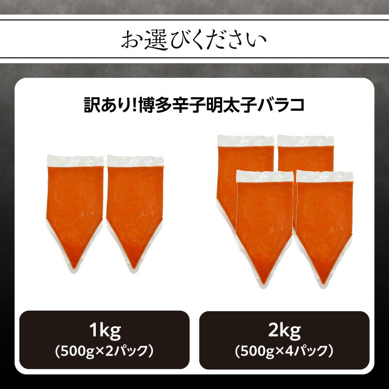- 【ふるさと納税】【選べる内容量】訳あり!博多辛子明太子バラコ 1kg(500g×2p)・2kg(500g×4p) 明太子 めんたいこ 切子 小分け おつまみ パスタ 卵焼き 訳あり わけあり 家庭用 福岡 八女市