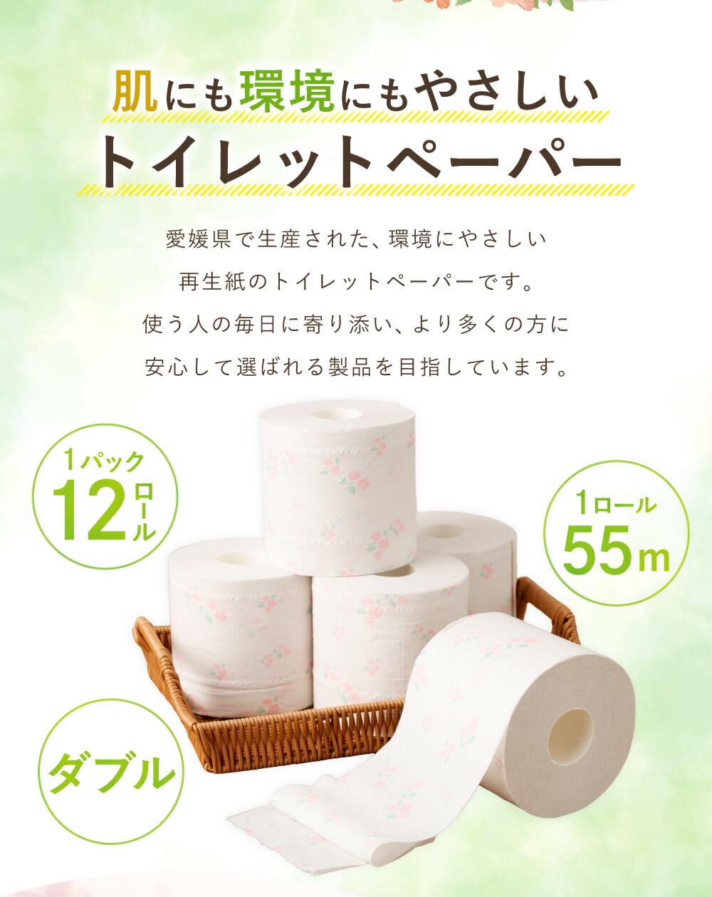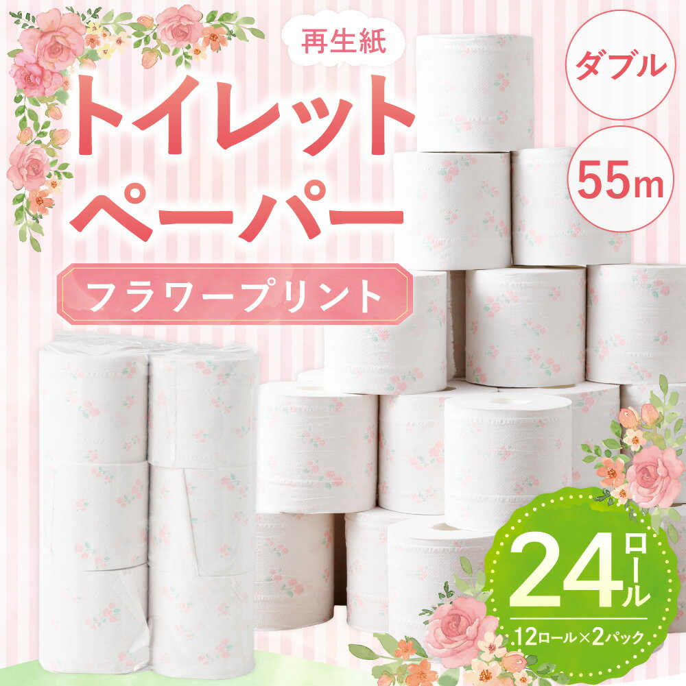 - 【ふるさと納税】プリントロール(フラワープリント) トイレットペーパー 55m ダブル 計24ロール(12ロール×2パック) 再生紙 古紙100% やさしい 肌触り トイレ 花柄 日用品 生活用品 生活雑貨 消耗品 常備品 防災 愛媛県 送料無料 (1024)