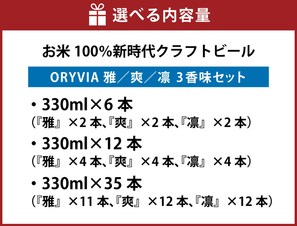 【ふるさと納税】<選べる容量>お米100%新時代クラフトビール「ORYVIA(オリビア)」「雅」「爽」「凛」3香味 (6本/12本/35本セット)クラフトビール ビール お酒 セット 米麹 グルテンフリー お米 酒 飲料 家飲み 晩酌 ご褒美 ギフト 冷蔵 三重県 桑名市 送料無料