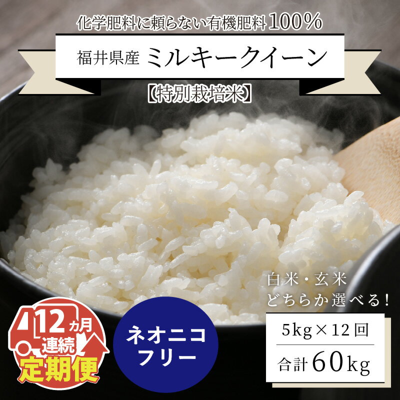 【ふるさと納税】【先行予約】 【令和8年産・新米】 【12ヶ月連続お届け】【特別栽培米】福井県産 ミルキークイーン 5kg × 12回 計60kg ネオニコフリー 【2026年10月以降順次発送予定】 【 白米 玄米 お米 ごはん 5キロ 産地直送 定期便 お楽しみ ふるさと納税米 】