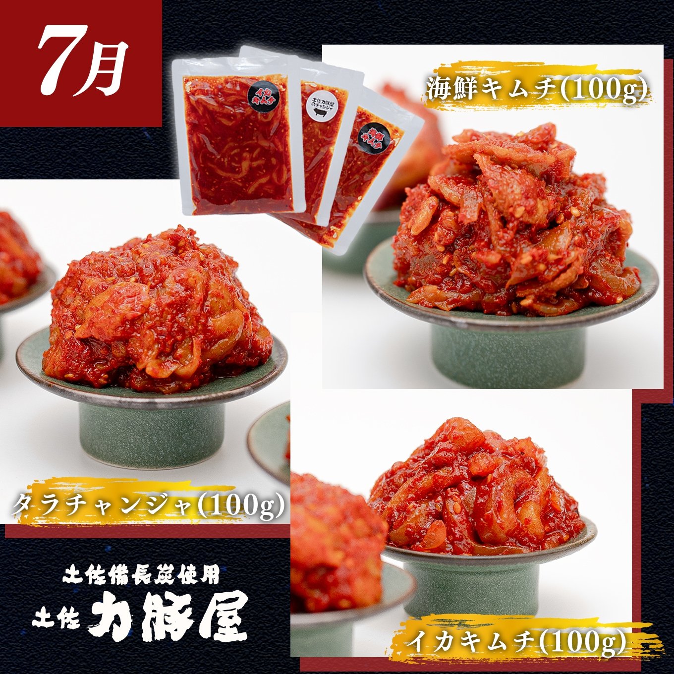 - 【定期便 3回】豚肉 ハラミ ホルモン キムチ 国産 焼肉用 7~9月|ブランド豚 真空パック 炒め物 おかず おつまみ お弁当 おすすめ 贈答用 家庭用 チャンジャ キムチ 珍味 BBQ 小分け 個包装 土佐力豚屋 高知県 大月町