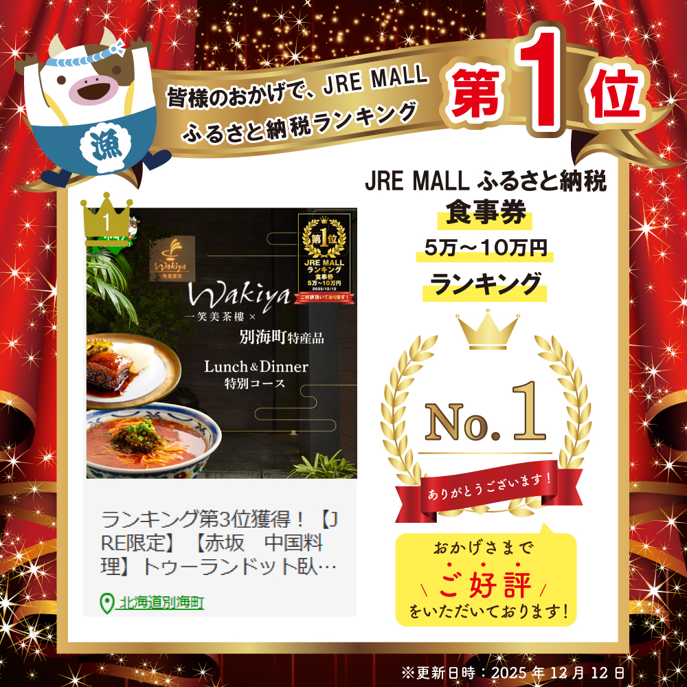 - 【JRE限定】御礼!ランキング第1位獲得!【赤坂 中国料理】トゥーランドット臥龍居 or Wakiya一笑美茶樓 別海町Aコースお食事券1名様【CC0000149】(ふるさと納税 レストラン ランチ ディナー 東京 コース料理)