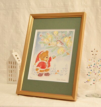 フレーム入り版画「くまさんのクリスマス」 絵本作家おまたたかこジークレー版画 【インテリア・フレーム入り・額縁・壁掛け用の紐・ジークレー・版画】