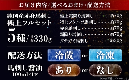 - 【冷蔵 馬刺し専用醤油付き】純国産馬 馬刺し極上フルセット計約330g 馬刺し専用醤油付き(極上霜降り/約70g 特上フタエゴ/約70g 霜降り/約70g タテガミ/約50g 赤身/約70g) / ばさし 馬刺 熊本馬刺し 熊本県 菊陽町【株式会社古閑ファーム】 [BHDF014]