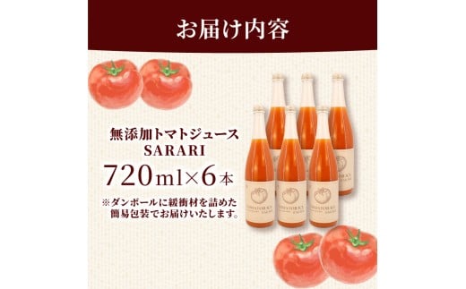 トマトジュースSARARI 720ml×6本 ジュース トマト 野菜ジュース 食塩無添加 無添加 無塩 砂糖不使用 糖度8度以上 飲み物 飲料 リコピン 野菜 ドリンク 果実 ストレート ストレートジュース ご褒美 送料無料 千葉県 旭市 株式会社 はなわ農園 hnw018