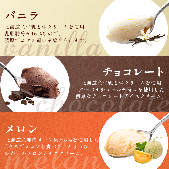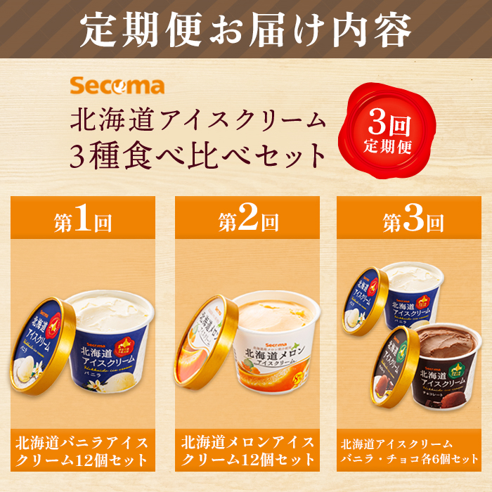 - 【定期便:3回】Secoma 北海道アイスクリーム3種食べ比べセット(バニラ・メロン・チョコレート)【01105】