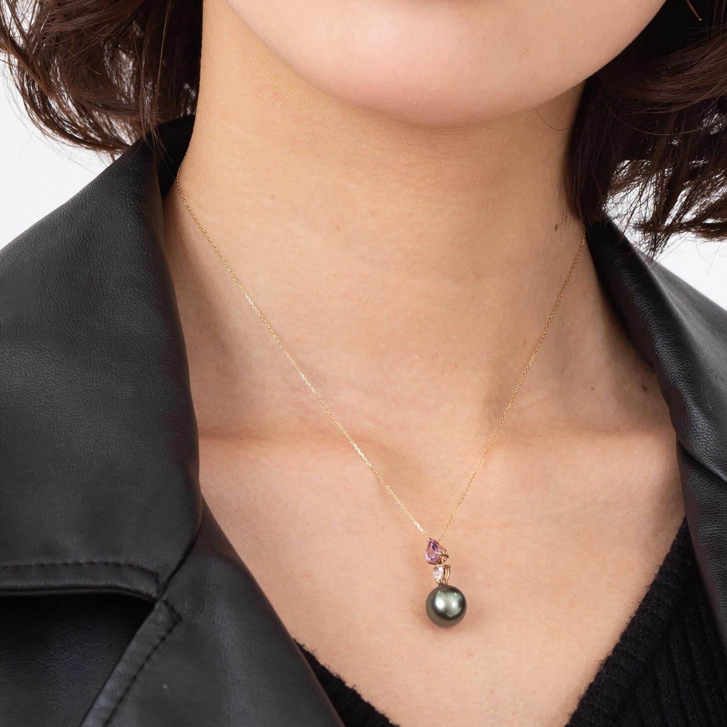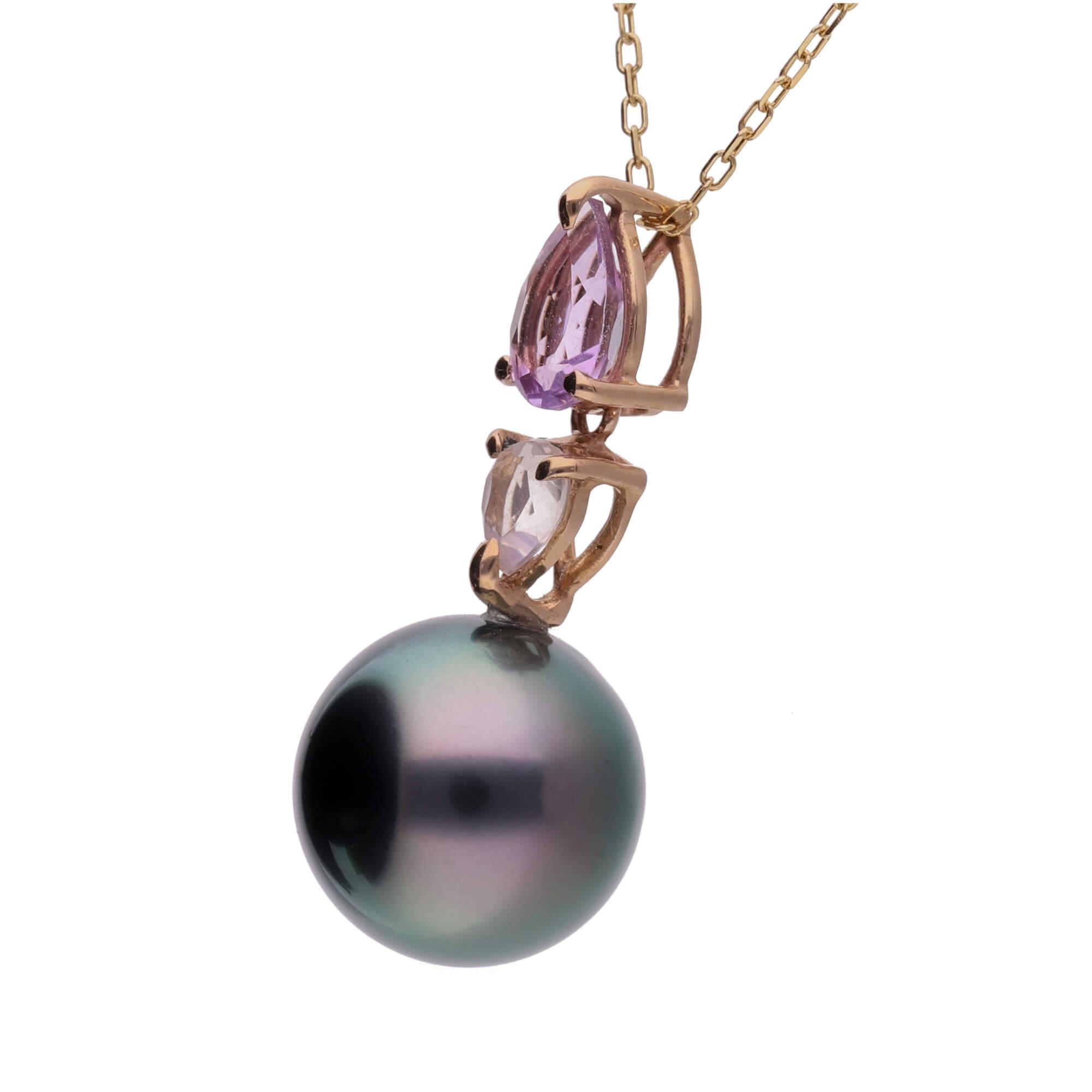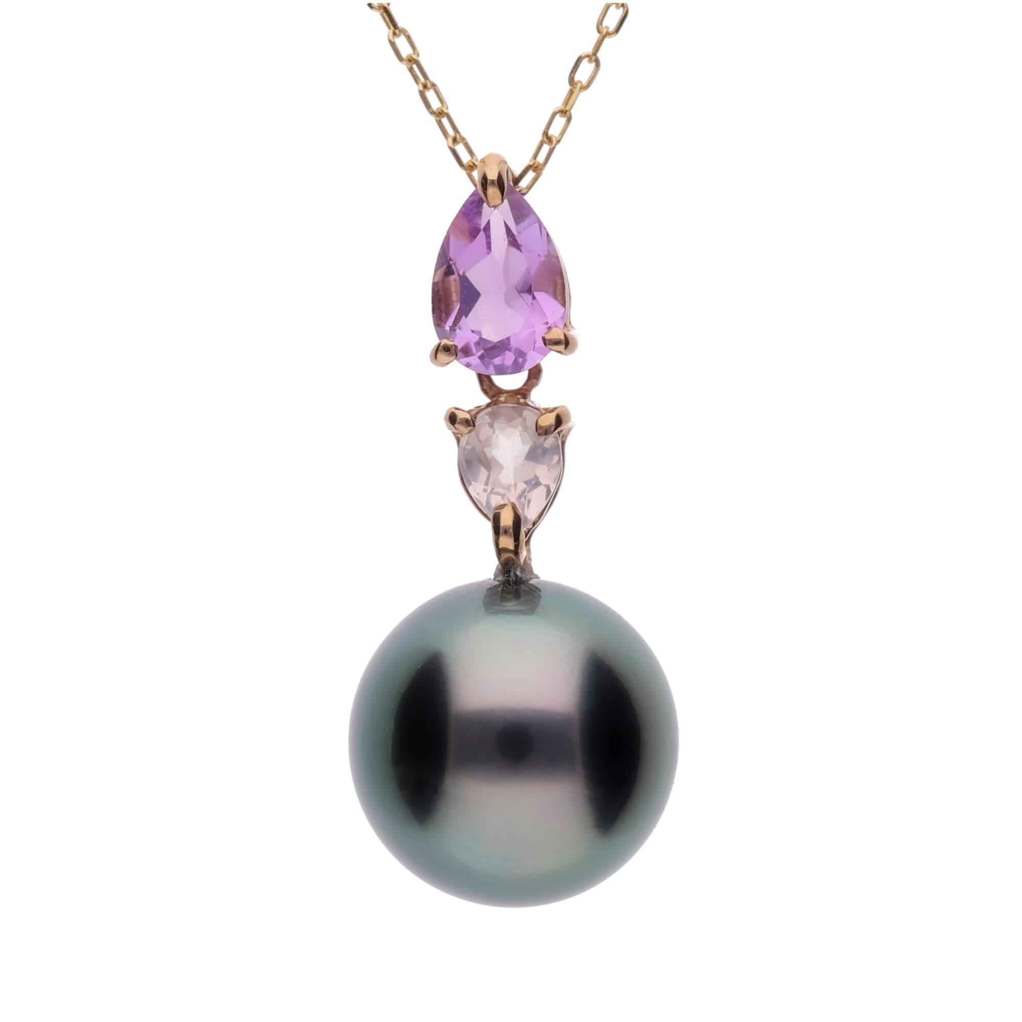 - 【桔梗】ブラックパール(タヒチ 黒蝶真珠) 10mm セミラウンド アメジスト ローズクォーツ K18 ピンクゴールド ペンダントトップ