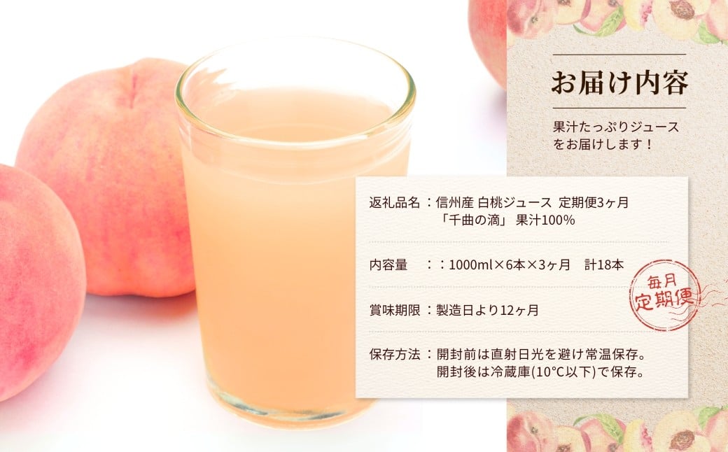 - 【定期便3ヶ月】信州産 白桃ジュース 「千曲の滴」 ストレート果汁100% (1L×4本) | 川中島白桃 桃 もも モモ ピーチ フルーツ 果物 砂糖不使用 ストレート ジュース 飲料 飲み物 ドリンク 瓶 人気 おすすめ お取り寄せ ギフト プレゼント 贈答品 信州 長野 千曲市