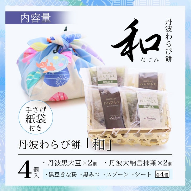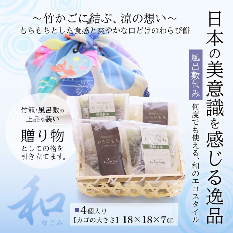 丹波素材のわらび餅「和」 竹籠&風呂敷包装 4個 紙袋付き :2種類 ( 丹波黒大豆 丹波大納言抹茶 ) | 和 黒蜜 手作り 自家製 黒糖 丹波黒豆 丹波大納言 抹茶 抹茶 わらび餅 和菓子 スイーツ お中元 夏ギフト 贈答用 プレゼント 竹籠 風呂敷包み 京都舞鶴
