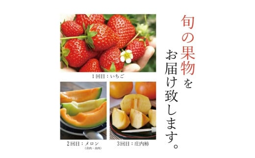 - ≪3回定期便≫ 自然の恵み 春・夏・秋フルーツ定期便(2)2026 4月下旬~5月下旬 おとめ心 いちご 7月上旬~7月下旬 彩りメロン 青肉 赤肉 10月中旬~11月下旬 柿 計3回 山形県酒田産 着日指定不可 頒布会 イチゴ カキ 春 夏 秋 JAそでうら SC0629