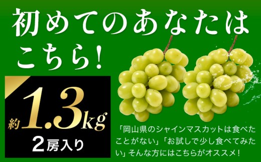 - 【アフター保証付】シャインマスカット 厳選 訳あり シャインマスカット 約1.3kg 2房【2026年先行予約】《9月上旬-11月上旬頃に出荷》岡山県 浅口市 シャインマスカット ぶどう フルーツ 果物 贈り物 ギフト 国産 岡山県産 送料無料 ブドウ