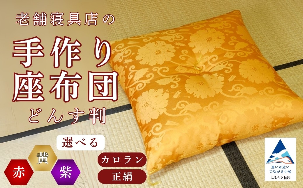 - 老舗寝具店の手作り座布団 (選べる種類 鹿の子柄 45×45(ピンク)/鹿の子柄 45×45(ブルー)/鹿の子柄 68×120(ピンク)/の子柄 68×120(ブルー)/カロラン どんす判 63×68(赤)/カロランどんす判 63×68(黄)/カロランどんす判 63×68(紫)/正絹どんす判 63×68(赤)/正絹どんす判 63×68(黄)/正絹どんす判 63×68(紫)金襴夫婦判 67×72)