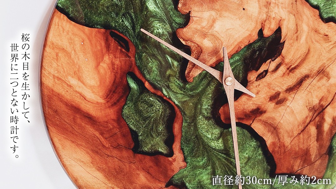 桜の木とレジンで作った 壁掛け時計 《深い森》 一年保証付き 大工 建築家 職人 天然木材 手作り 工芸品 民芸品 インテリア 家具 時計 [CM018sa]