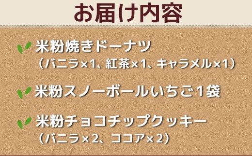 富山県産米粉焼き菓子セット(米粉焼きドーナツ:バニラ・紅茶・キャラメル、米粉スノーボールいちご、米粉チョコチップクッキー:バニラ・ココア)※北海道・沖縄・離島への配送不可