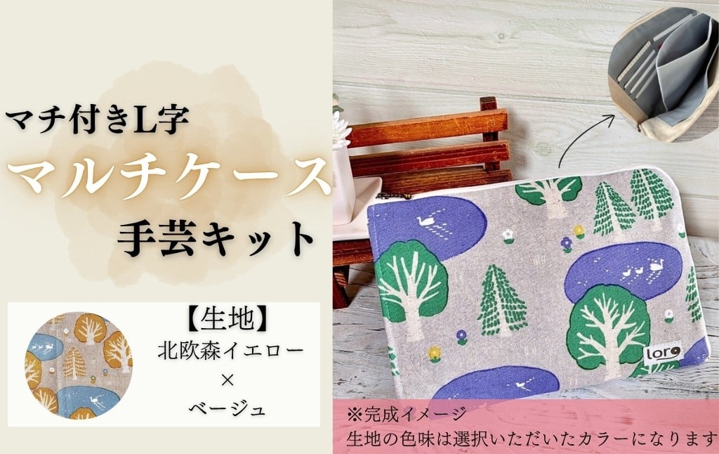 - マチ付きL字マルチケース手芸キット【生地 北欧森グリーン×ブルーグレー】/【生地 北欧森イエロー×ベージュ】| 手芸キット 中級者 マルチケース ポーチ ハンドメイド 北欧風 手芸用品 手づくり 長野県 千曲市