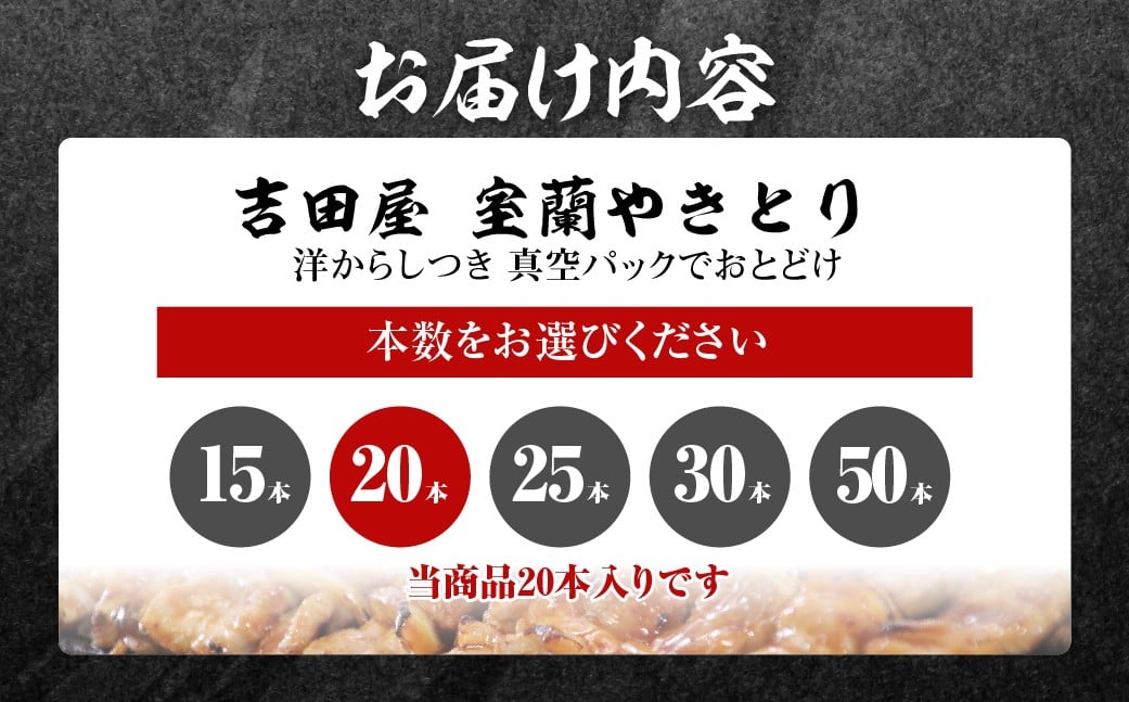 - 吉田屋 室蘭やきとり20本 【 ふるさと納税 人気 おすすめ ランキング 北海道 室蘭 やきとん 20本 やきとり 焼き鳥 豚肉 皮 串 串焼きタレ たれ焼き おつまみ 酒 セット 詰合せ 北海道 室蘭市 送料無料 】 MROAB002