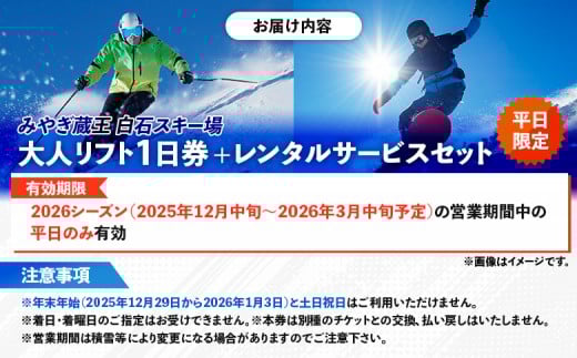- 【平日限定!】冬を満喫!みやぎ蔵王 白石スキー場「リフト1日券+レンタルサービス」セット | スキー リフト券 リフト 冬 ウィンタースポーツ スノボ スキー場 絶景 ゲレンデ 初心者 上級者 満喫 旅行 リフト お取り寄せ 宮城県 白石市 白石【30003】