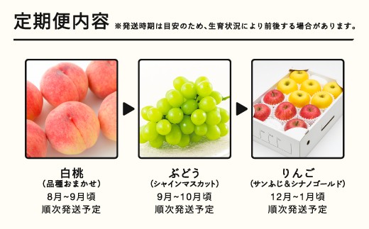 - 【先行予約】【夏始まり】フルーツ定期便 全3回 2026産 令和8年産 白桃 ぶどう シャインマスカット りんご サンふじ シナノゴールド 果物 送料無料 ns-ft3xx-sm ※沖縄及び離島への配送不可
