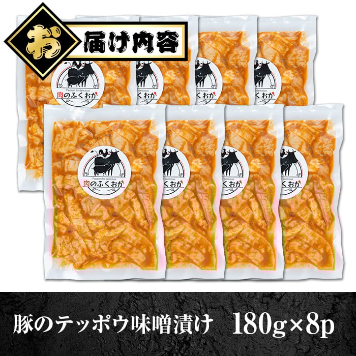 - A79013 豚肉のテッポウ 自家製味噌ダレ味付き(計1.44kg・180g×8P) 鹿児島 国産 豚肉 豚テッポウ てっぽう ホルモン あぶら チューブ みそだれ 味噌づけ 味噌漬け おつまみ 小分け パック 冷凍 冷凍食品【肉のふくおか】