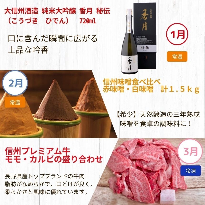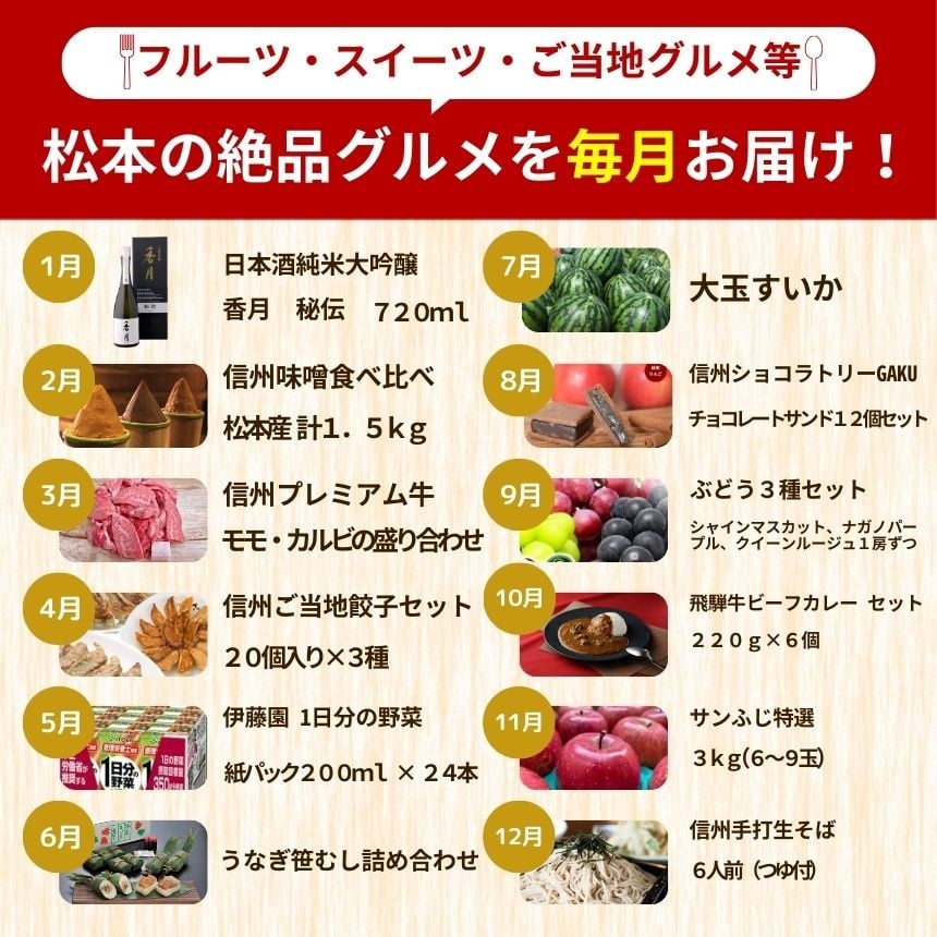 - 長野県 定期便 < 決定版 > 厳選 信州松本 セレクト便( 定期便 12回 ) | ふるさと納税 定期便 地酒 信州味噌 信州牛 健康 ドリンク うなぎ すいか フルーツ 葡萄 りんご そば 信州蕎麦 信州 長野県 松本市 人気 オススメ 便利