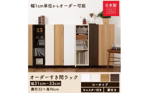 【国産家具】オーダーすき間ラック〔キャスター・扉付き・ロータイプ 31cm~33cm 〕(選べる4色×3サイズ)すき間ラック 収納棚 約 奥行32 高さ96 扉付き キャスター付き スリム 薄型 木製 扉付 5段 ABE400110