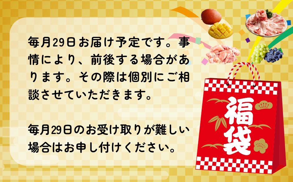 【定期便・全12回】新春おたのしみ 福袋 梅(牛肉 豚肉 鶏肉 果物 フルーツ 限定 2026 定期便 宮崎 小林市)