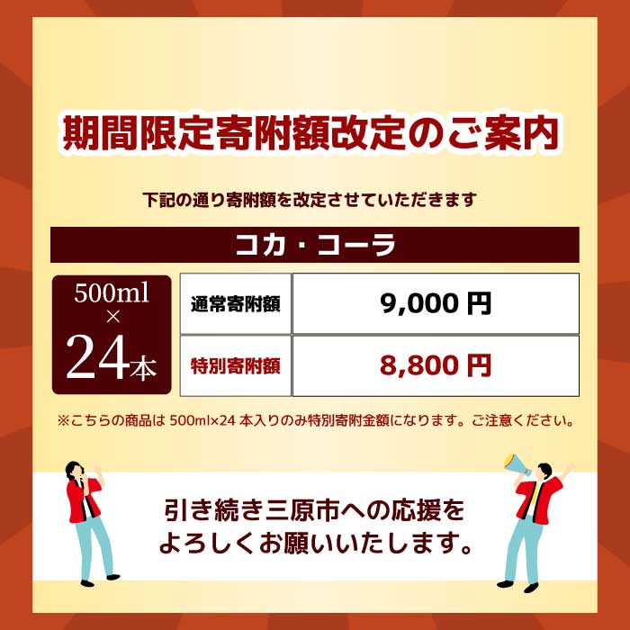 - 期間限定《特別寄附額》コカ・コーラ PET 500ml×24本(1ケース) 炭酸飲料 ソフトドリンク ペットボトル コーラ ジュース 箱買い まとめ買い 014001