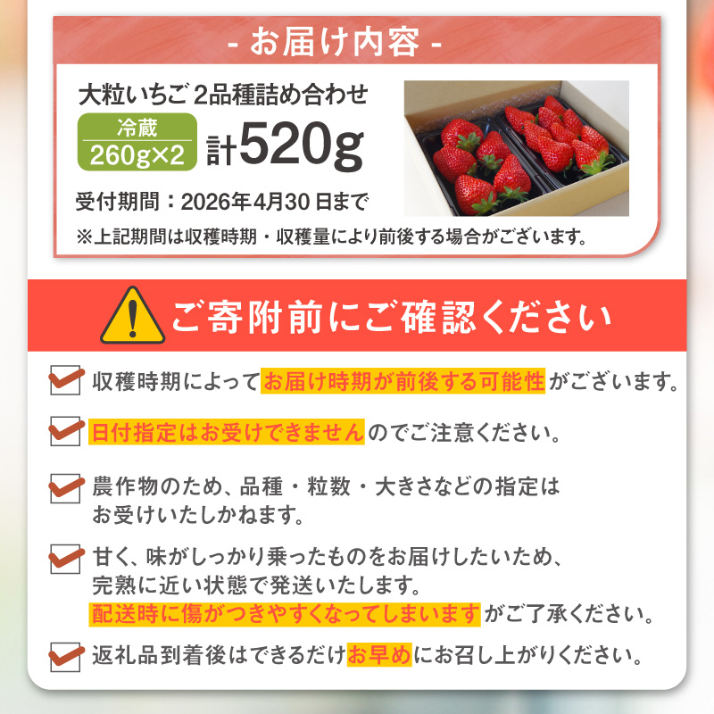 【先行予約】【2月頃発送予定】大粒いちご2品種詰め合わせ 260g×2パック いちご 苺 イチゴ ストロベリー 詰め合わせ 食べ比べ おいCベリー 紅ほっぺ 章姫 食べ比べ 美味しい 甘い 大粒 大きい 果物 フルーツ 数量限定 farmいちごろ 愛知県 常滑 常滑市