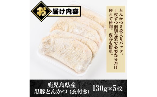 A79016 鹿児島県産 黒豚とんかつ 衣付き (計650g・約130g×5枚) 鹿児島 国産 豚肉 黒豚 トンカツ 豚カツ お肉 揚げ物 加工品 時短 簡単 惣菜 おかず 冷凍【肉のふくおか】