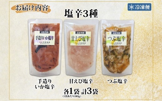 北海道 塩辛 3種セット 手造りいか塩辛 甘えび塩辛 つぶ塩辛 180g 各1袋 海鮮 生鮮 珍味 おつまみ ご飯 おかず お酒 晩酌 お取り寄せ グルメ 冷凍 竹田食品 送料無料 函館市 _HD134-049