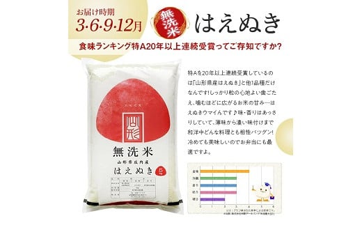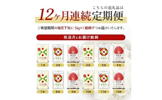 - 1349T02 【定期便】無洗米3銘柄定期便 5kg×12ヶ月連続 計60kg(2月~1月) つや姫 雪若丸 はえぬき