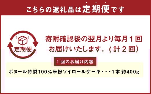 - 【2ヶ月定期便】ボヌール特製 100%米粉ソイロールケーキ×1本 約400g ロールケーキ ケーキ 洋菓子 お菓子 菓子 グルテンフリー スイーツ 大豆 ソイ 米粉 冷凍 2ヶ月 定期便 定期