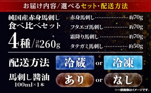 - 【冷蔵 馬刺し専用醤油付き】純国産馬 馬刺し食べ比べセット計約260g 馬刺し専用醤油付き(赤身/約70g フタエゴ/約70g 霜降り/約70g タテガミ/約50g) / ばさし 馬刺 熊本馬刺し 熊本県 菊陽町【株式会社古閑ファーム】 [BHDF010]