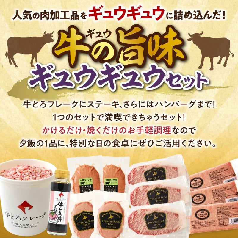 数量限定&特別セット!十勝スロウフード厳選!牛の旨みギュウギュウセット!牛とろ 牛トロ丼 牛トロフレーク ステーキ サーロインステーキ ハンバーグ 焼くだけ 簡単調理 牛トロ ギュウトロ 牛肉 肉_S006-0258